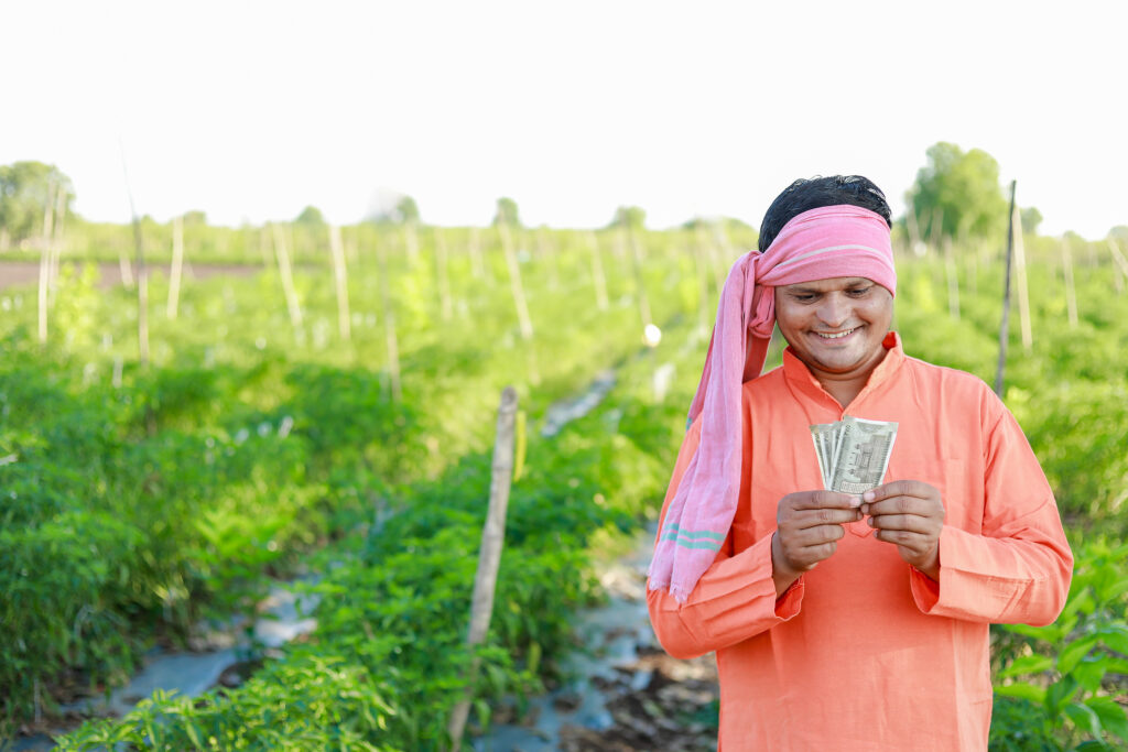 Happy Indian farmer, farmer holding indian rupees in hands, smart farming