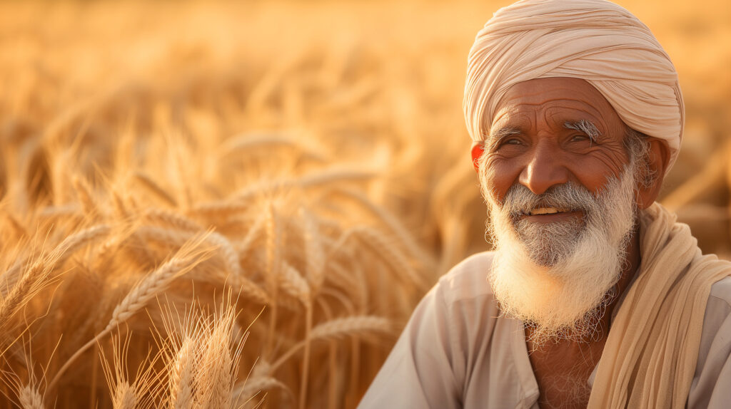 an old man in traditional punjabi clothes, wheat field background, full body, vaisakhi, baisakhi, smile –ar 16:9 –v 6 Job ID: a0b2e104-09f5-4b36-8614-e718a117aa06