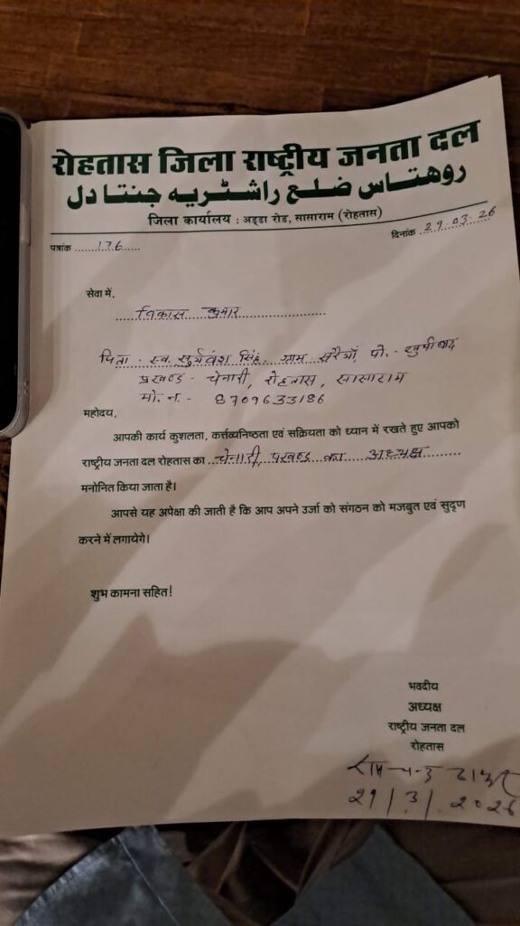 जारी पत्र में कहा गया है कि विकास कुमार की पार्टी के प्रति कार्यकुशलता, कर्तव्यनिष्ठा और निरंतर सक्रियता को देखते हुए उन्हें चेनारी प्रखंड का अध्यक्ष मनोनीत किया जाता है। पार्टी नेतृत्व ने उनसे अपेक्षा जताई है कि वे अपनी ऊर्जा और संगठनात्मक क्षमता का उपयोग करते हुए संगठन को और अधिक मजबूत बनाएंगे।
